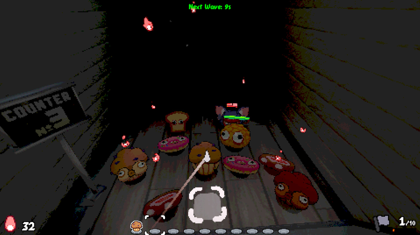 Baking Dead is a first person Tower Defense game, where you need to exterminate various hostile Pests using sentient, self-defence-equipped Pastries! Use your vacuum cleaner to collect floating pink sparks to bake Pastries yourself. You can then place them down on one of the four five-lane grid fields, to fend-off the crawling Pests, DO NOT let them reach YOU.
